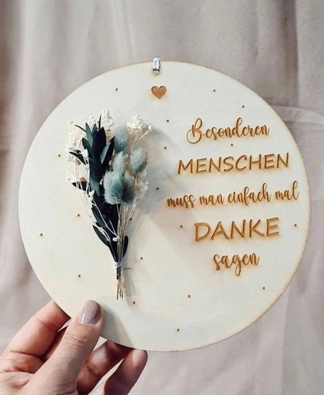 Liebevolle Geschenk-Idee um besonderen Menschen DANKE zu sagen. Material Holz, Durchmesser 20cm, mit Trockenblumen liebevoll verziert, Aufhängung vorhanden