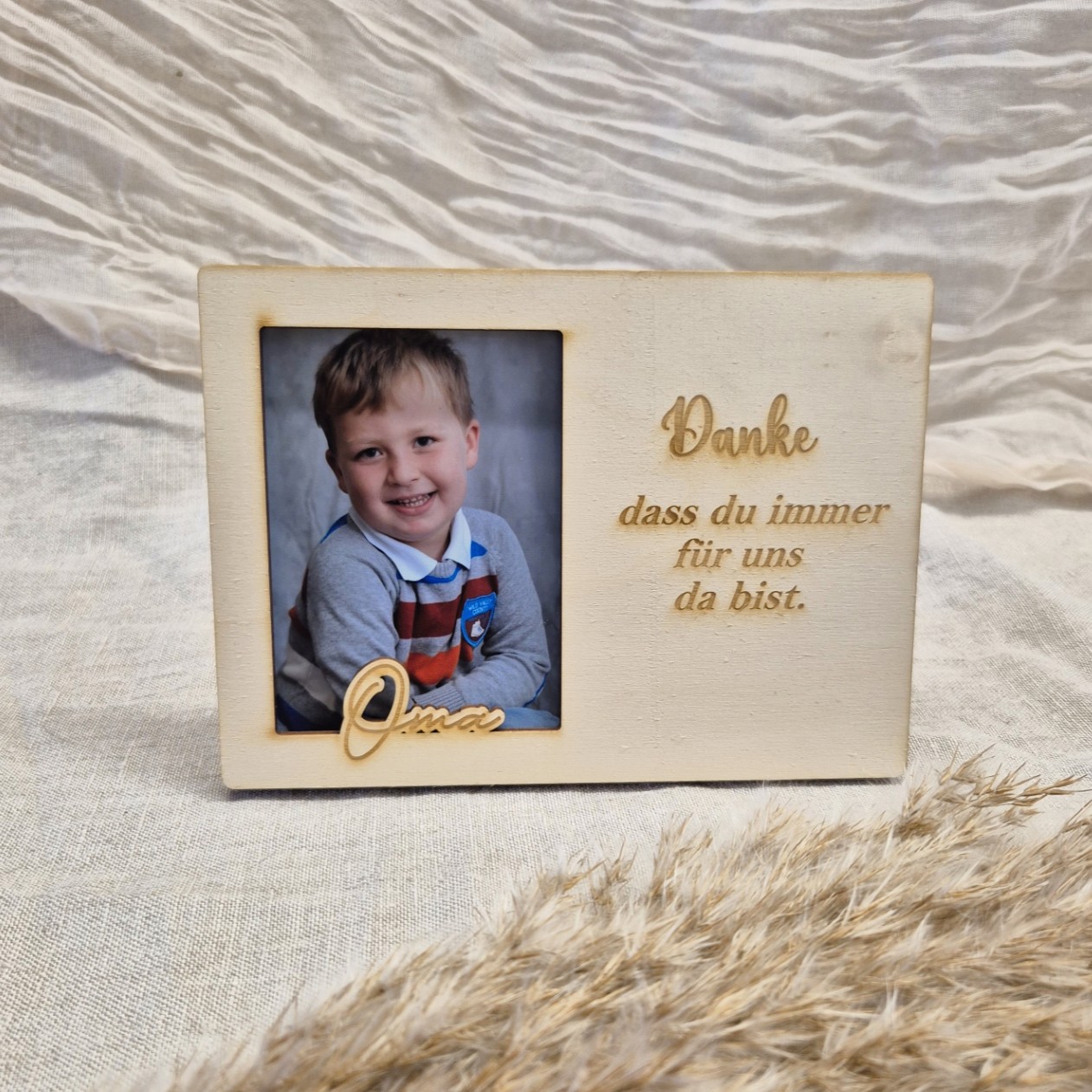 Überrasche deine Oma mit einem personalisierten Bilderrahmen aus Holz. Die liebevolle Gravur „Danke, dass du immer für uns da bist“ macht dieses Geschenk zu einer besonderen Erinnerung voller Wertschätzung.