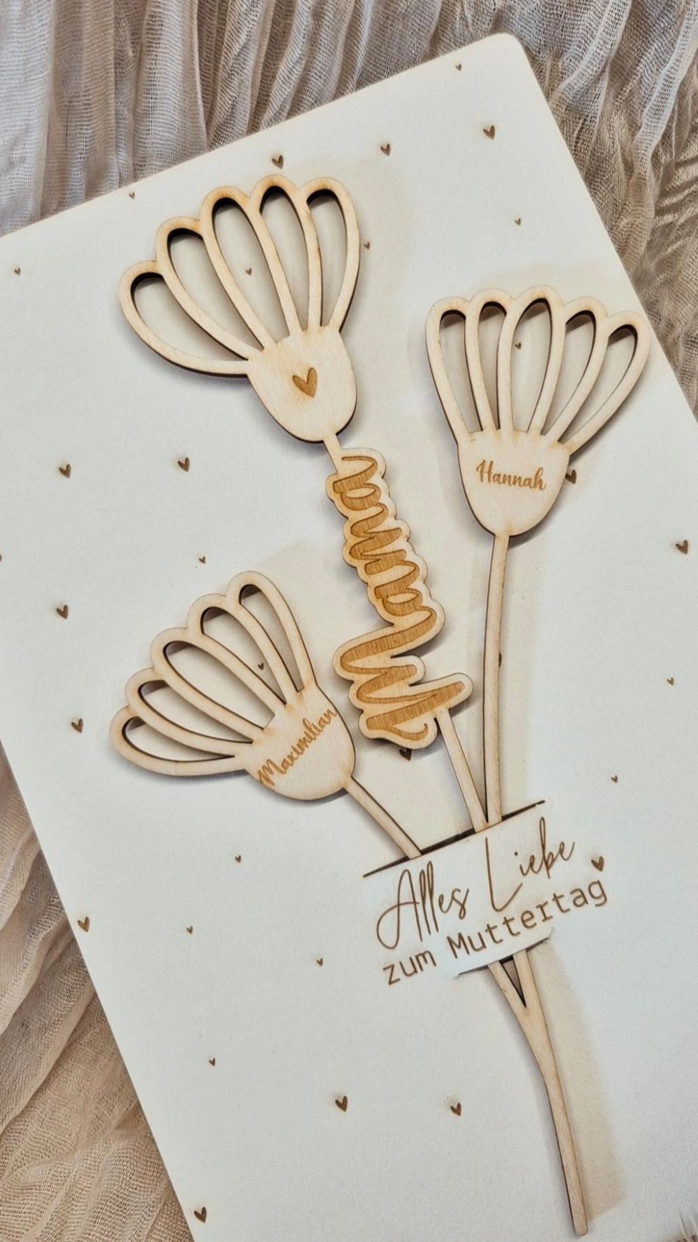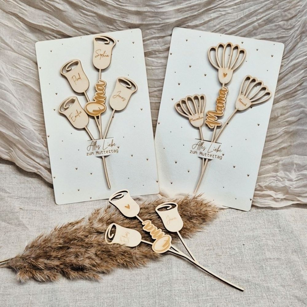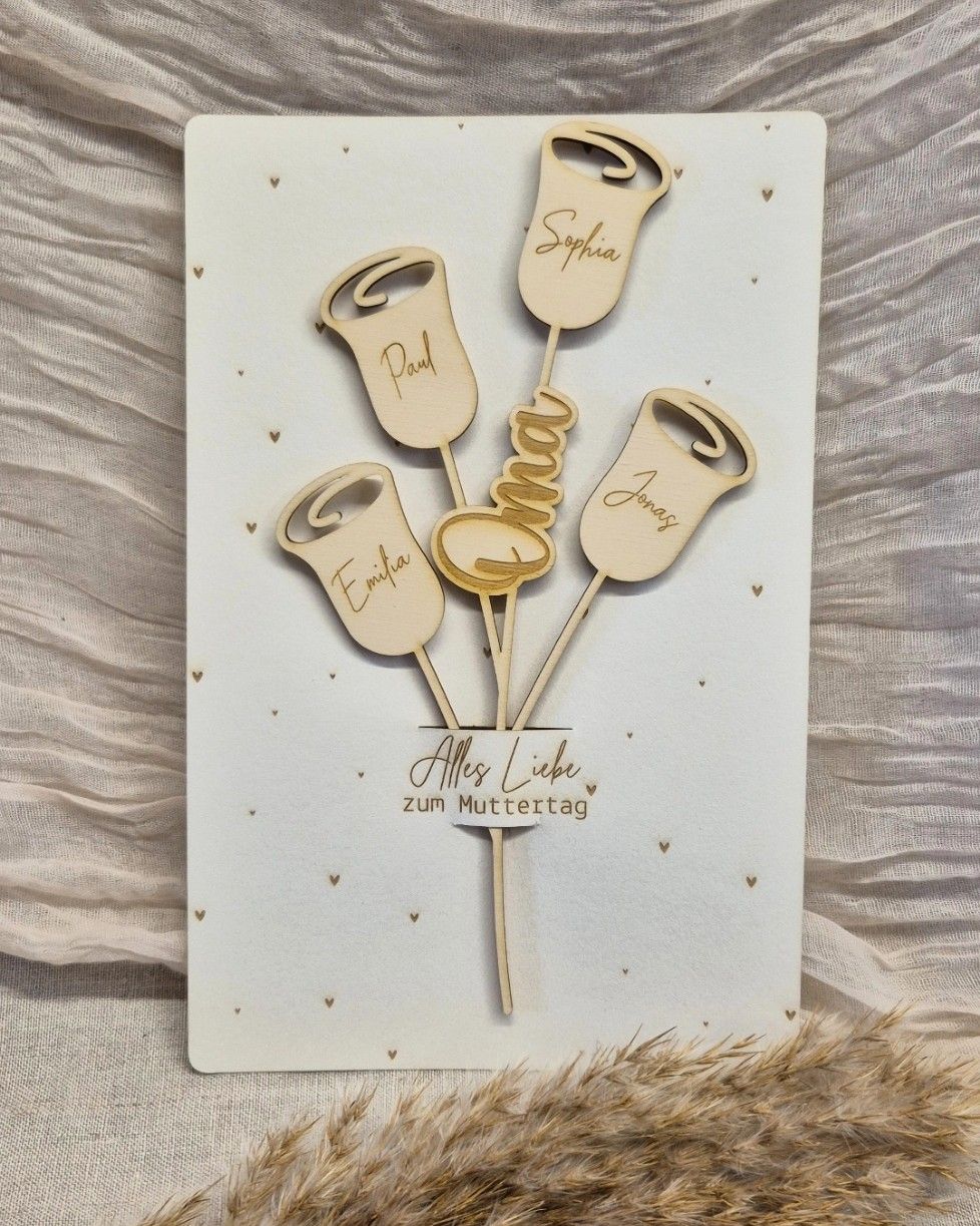 Jede Blume wird individuell mit den Namen der Kinder bzw. Enkelkinder graviert und macht so das Geschenk zu einem persönlichen Unikat.