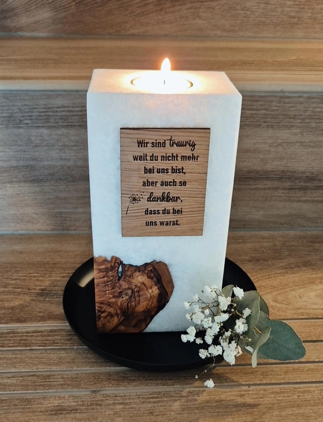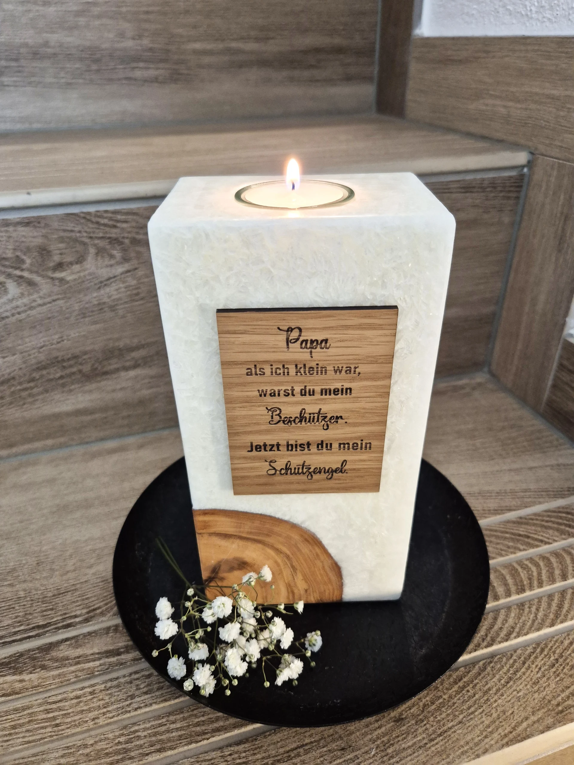 Mit ihren Abmessungen von 20 × 10 × 7 cm und dem Echtholz-Kern ist jede Kerze ein echtes Unikat. Die Gravur erfolgt auf hochwertigem Eichenholz und kann individuell angepasst werden – ob für Mama, Oma, Opa oder einen anderen Herzensmenschen.