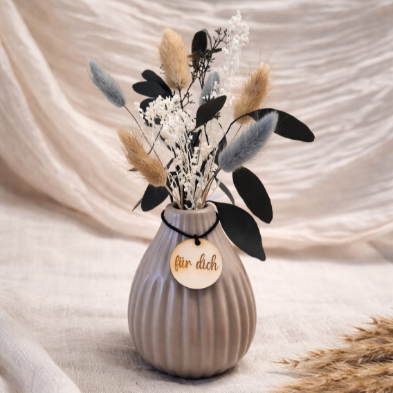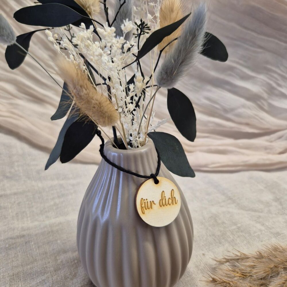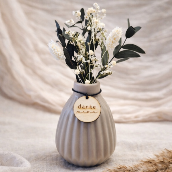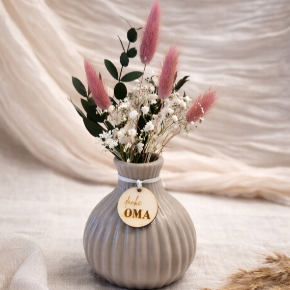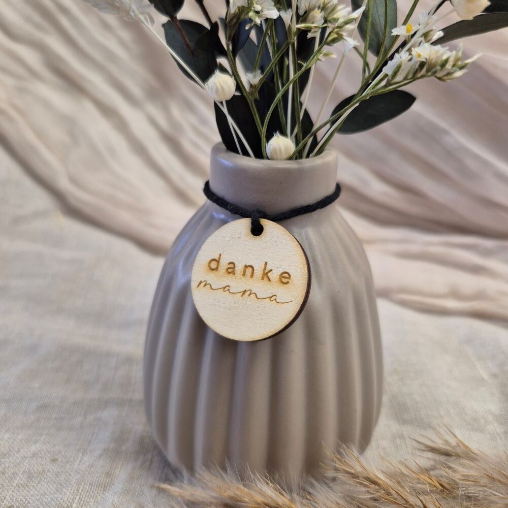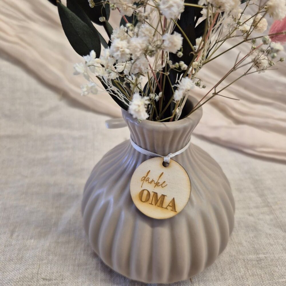 Das besondere Highlight ist der liebevoll gestaltete Anhänger aus Holz, der mit persönlichen Botschaften wie danke Mama“, „danke Oma“ oder „für dich“, versehen ist. So wird jede Vase zu einem einzigartigen Geschenk für besondere Menschen.